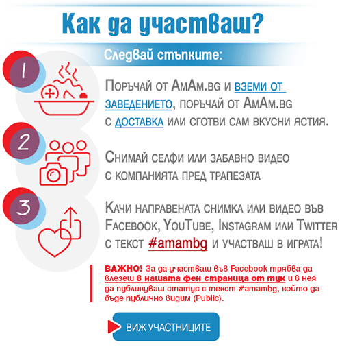 Направи селфи или забавно видео с компания пред трапезата, сподели го с хаштаг #amambg и участвай в играта на AmAm.bg, за да спечелиш някоя от страхотните награди!